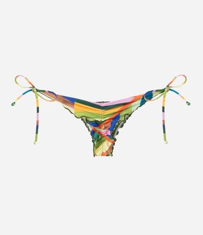Ref: Biquíni calcinha, lacinho, com efeito, empina bumbum, amarração nas laterais e estampa de folhagens.