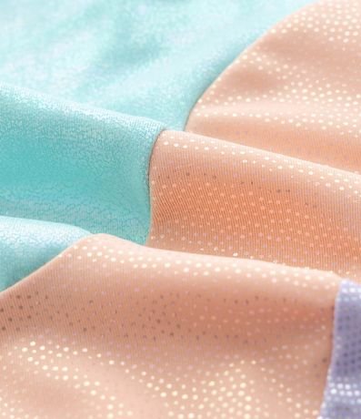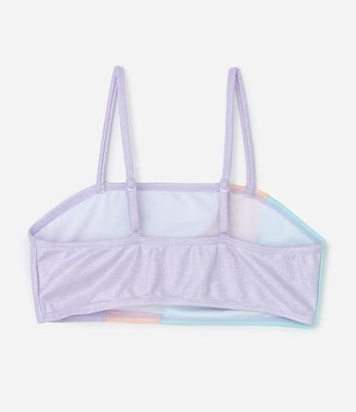 Biquíni infantil com duas peças, top e calcinha. Top com tiras finas ajustáveis e calcinha tradicional, ambos confeccionados em poliéster, com estampa de blocos de cor e metalizado.
