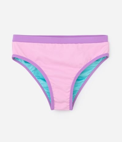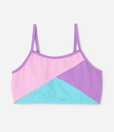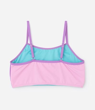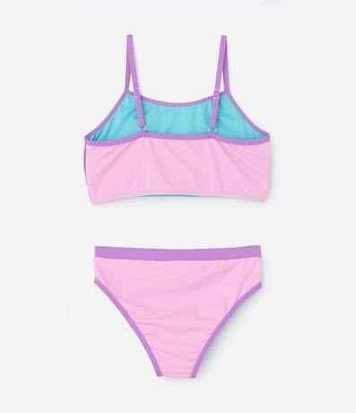 Ref: Biquíni infantil com duas peças, top e calcinha. Ambas as peças possuem recortes contrastantes e confeccionados em microfibra com proteção UV. Acompanha scrunchie.