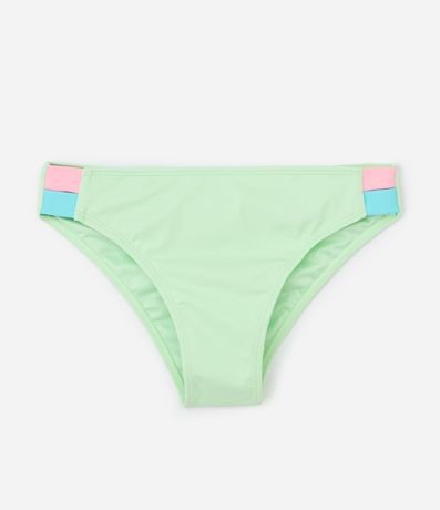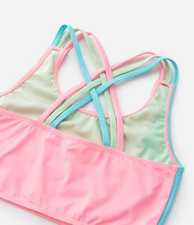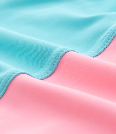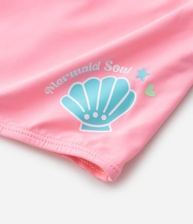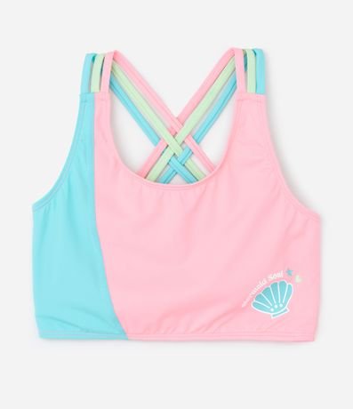 Ref: Biquíni infantil com duas peças, top e calcinha. Ambas as peças possuem estampa com recortes de cor confeccionados em microfibra. Top com alças cruzadas e estampa de concha.