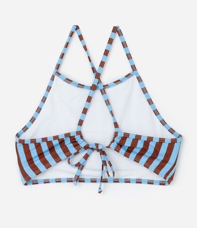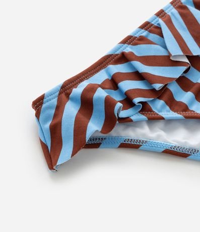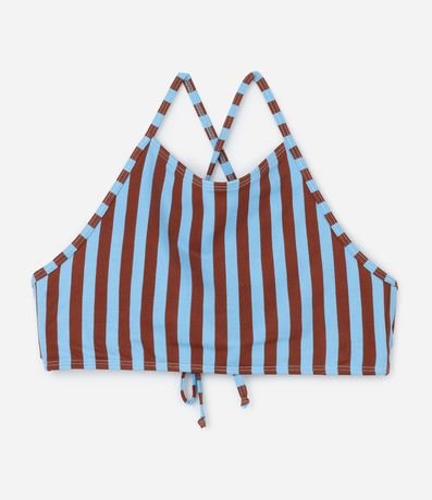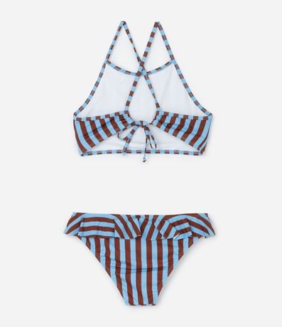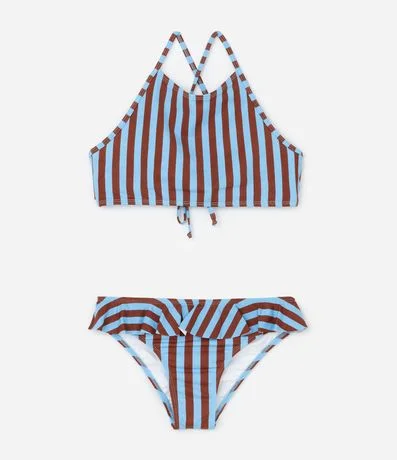 Ref: Biquíni infantil com duas peças, top e calcinha. Top com alças trançadas e amarração nas costas; calcinha com as laterais larguinhas. Ambos confeccionados em microfibra com estampa de listras.