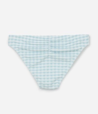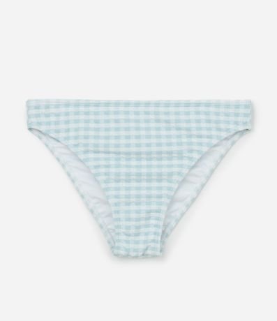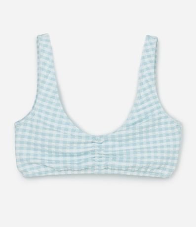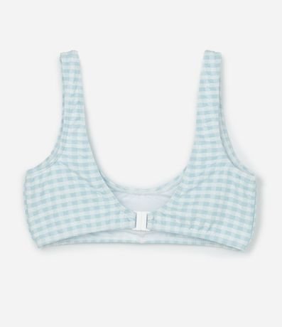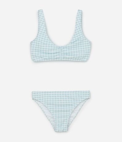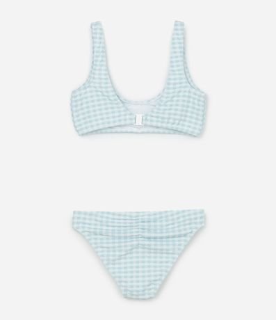 Ref: Biquíni infantil com duas peças, top e calcinha. Top com gola redonda, alças largas, fechamento traseiro e calcinha com as laterais larguinhas e ambas as peças com estampa xadrez vichy e franzidinhos.
