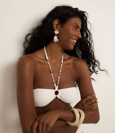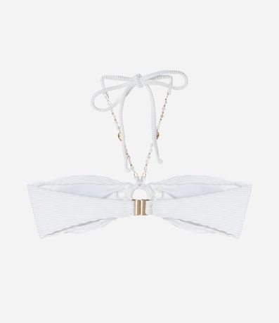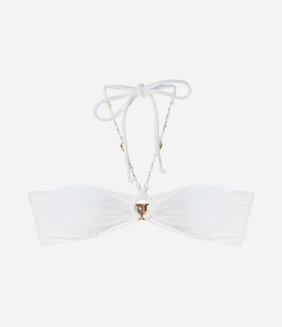 Ref: Peça avulsa de biquíni confeccionada em microfibra texturizada e com fio metalizado. O top modelo bandeau tem bojos removíveis, aro no busto e amarração no pescoço com conchinhas e pérolas artificiais.