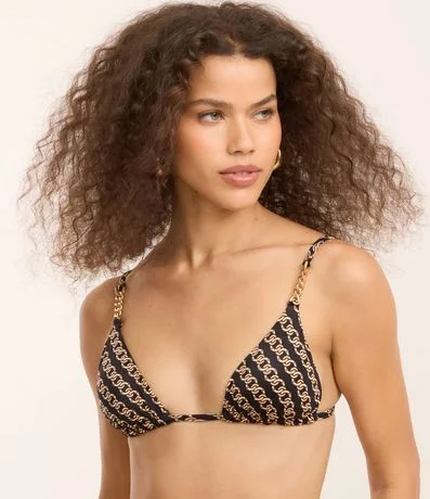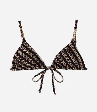 Peça avulsa de biquíni confeccionada em microfibra. O top modelo cortininha tem estampa de correntes estilo lenço, alças finas paralelas, amarração nas costas e detalhe super especial de elos metálicos.