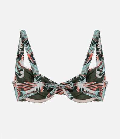 Biquíni top meia taça com decote coração, alças largas além de amarração laço nas costas e folhagens estampadas. Confeccionado em microfibra leve. Peça avulsa.