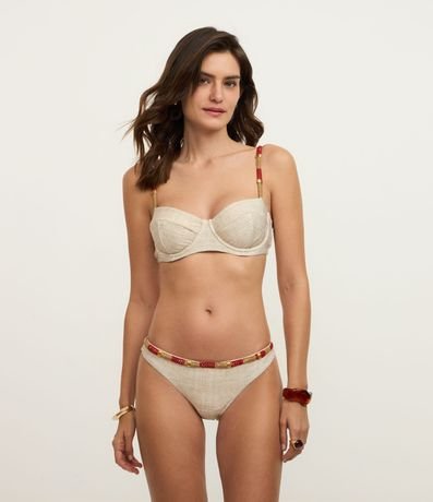 Ref: Peça avulsa de biquíni confeccionada em microfibra. O top meia taça tem estampa que faz alusão a um tecido tramado, parecido com linho, alças reguláveis e adorno de linhas nas alças. Roupa de banho com textura de linho.