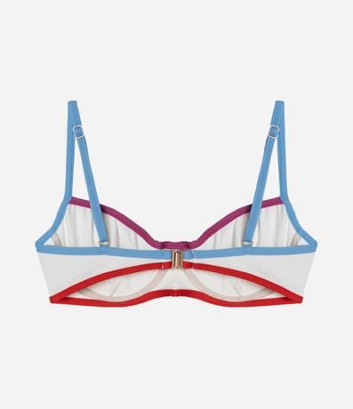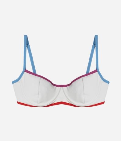 Ref: Top de biquíni confeccionado em microfibra texturizada, com modelagem meia taça e bojo para melhor sustentação. Possui viés colorido em vermelho, pink e azul, alças ajustáveis e fecho metálico.