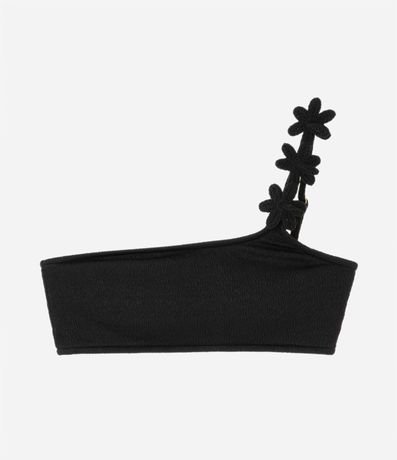 Ref: Biquíni top texturizado um ombro só com aplicação de flor de efeito crochê na alça e alças reguláveis.