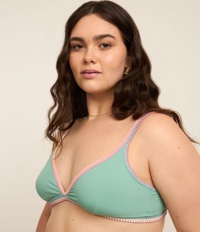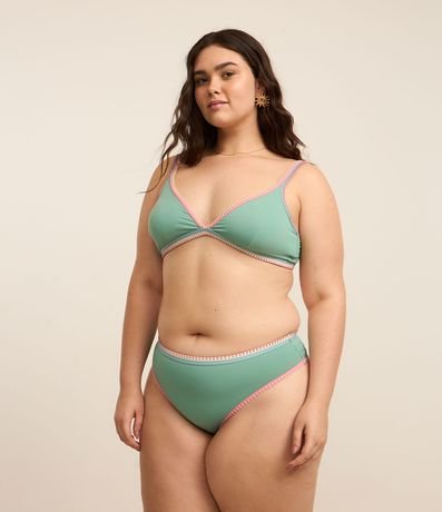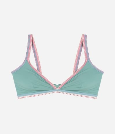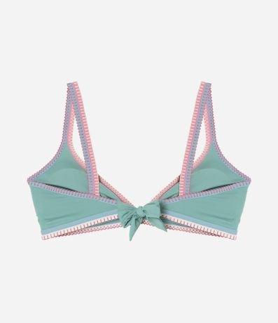 Ref: Peça avulsa de biquíni confeccionada em microfibra sem estampa. Top modelo triangulo fixo com alças fixas (sem regulagem), amarração nas costas e detalhe de vieses e crochê contrastantes.