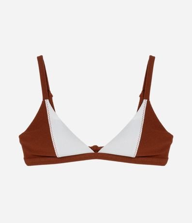 Peça avulsa de biquíni confeccionada em microfibra sem estampa e texturizada. O top triangular fixo taça tem recorte bicolor, alças ajustáveis, amarração nas costas e bojo removíveis.