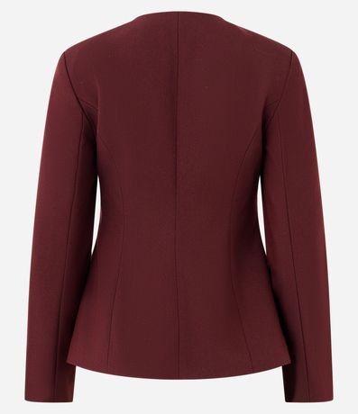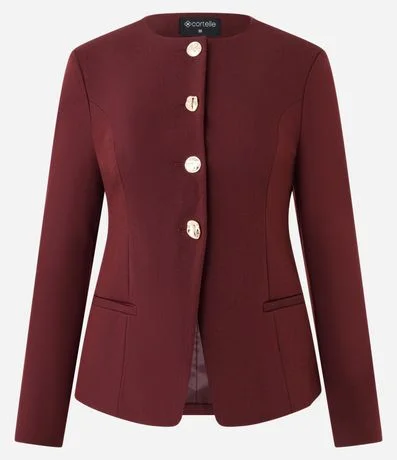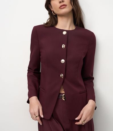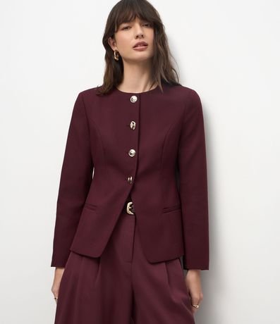Blazer feminino de alfaiataria com modelagem estruturada. Possui gola redonda, abotoamento frontal, bolsos embutidos, recortes que definem a silhueta e mangas longas ajustadas.