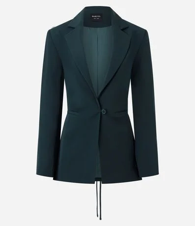 Blazer feminino confeccionado em poliéster. Possui modelagem alongada e estrutura levemente acinturada. Possui gola lapela clássica, fechamento frontal por um único botão e acabamento interno forrado. As mangas são longas, nas costas apresenta um recorte central com tiras ajustáveis entrelaçadas, que permitem amarração personalizada.