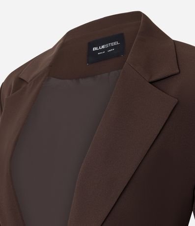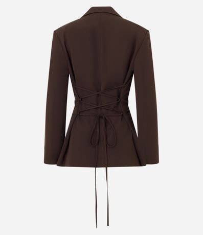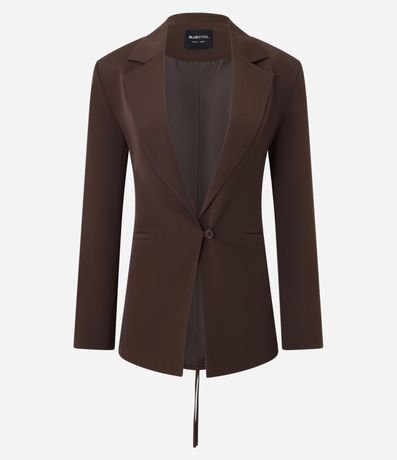 Blazer feminino confeccionado em poliéster. Possui modelagem alongada e estrutura levemente acinturada. Possui gola lapela clássica, fechamento frontal por um único botão e acabamento interno forrado. As mangas são longas, nas costas apresenta um recorte central com tiras ajustáveis entrelaçadas, que permitem amarração personalizada.
