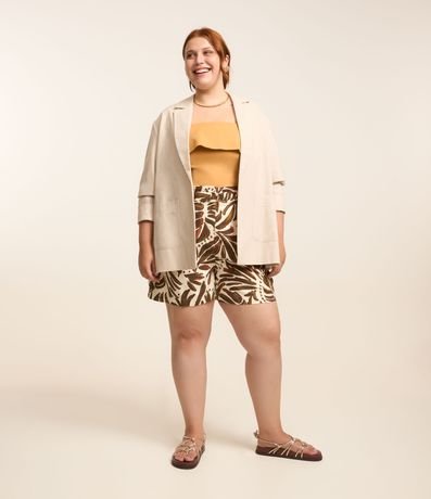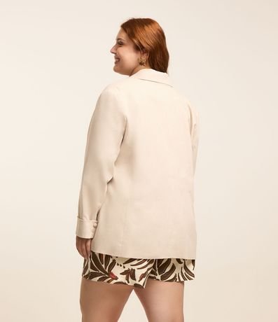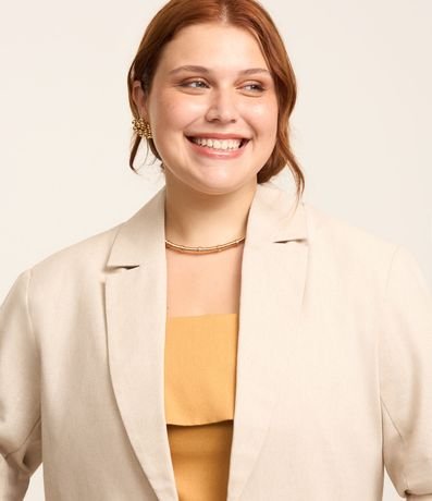 Ref: Blazer plus size confeccionado com viscose mais sustentável, linho e poliéster, sem estampa. A peça tem abertura total sem fechamento, gola lapela, bolsos chapados frontais e punhos com dobras e botões forrados.