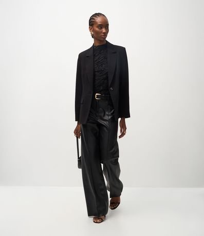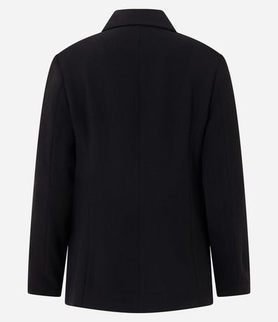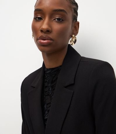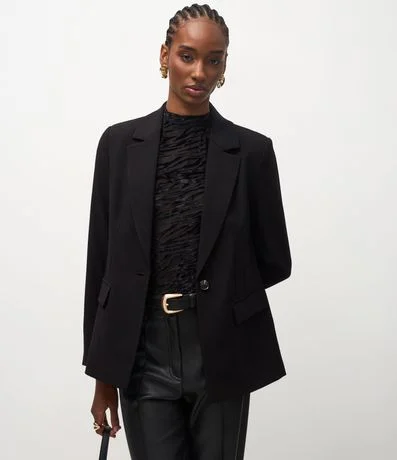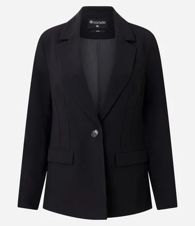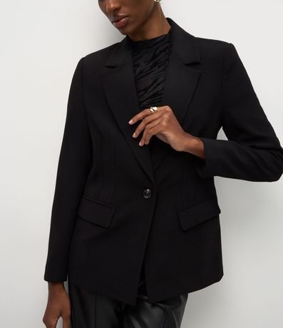Ref: Blazer feminino de alfaiataria com modelagem ampulheta que marca a cintura e estrutura bem definida. Possui lapelas clássicas, fechamento frontal com um botão, bolsos com abas e mangas longas.