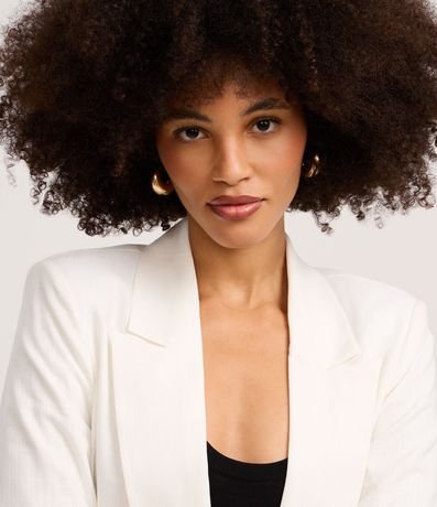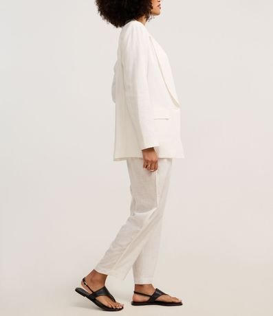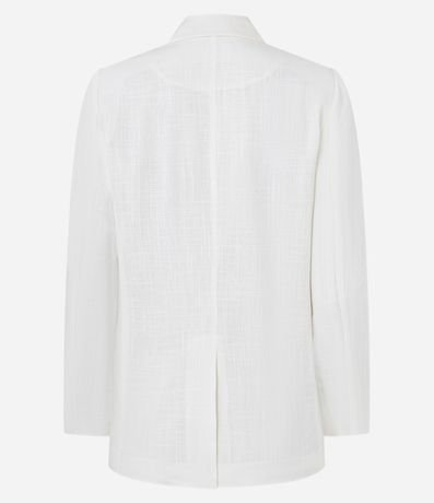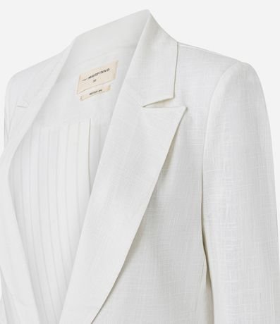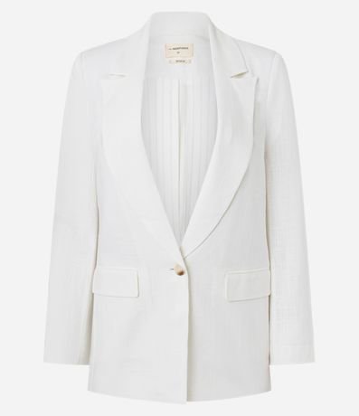 Blazer feminino confeccionado em viscose e linho, com fechamento por botão único e lapelas na frontal.