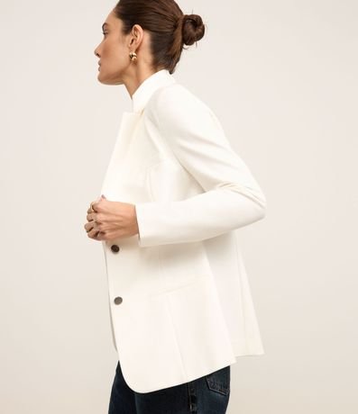 Blazer alongado slim, confeccionado em ponto roma, com decote V e bolsos embutidos. Possui fechamento frontal com abotoamento duplo.