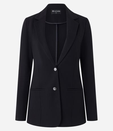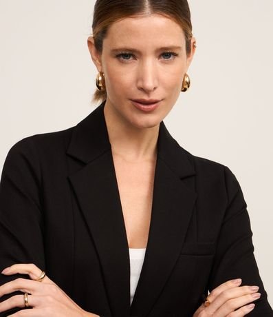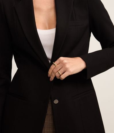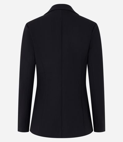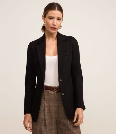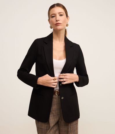 Ref: Blazer alongado slim, confeccionado em ponto roma, com decote V e bolsos embutidos. Possui fechamento frontal com abotoamento duplo.