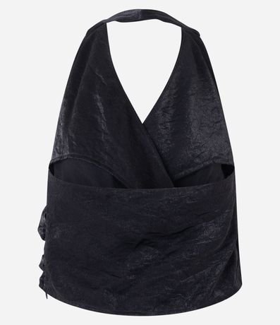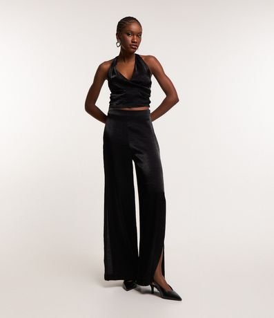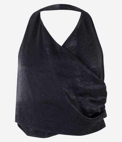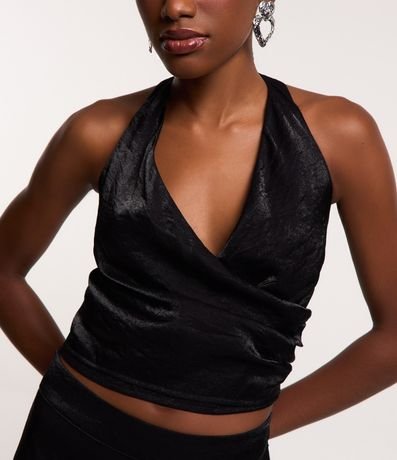 Blusa frente única com textura acetinada, decote v transpassado e franzidinhos na lateral.