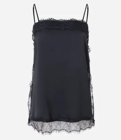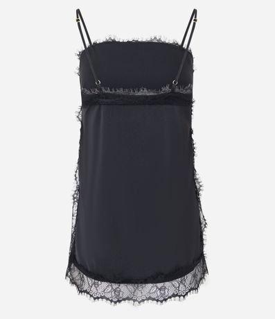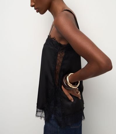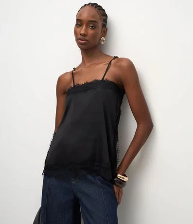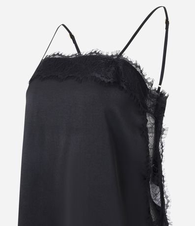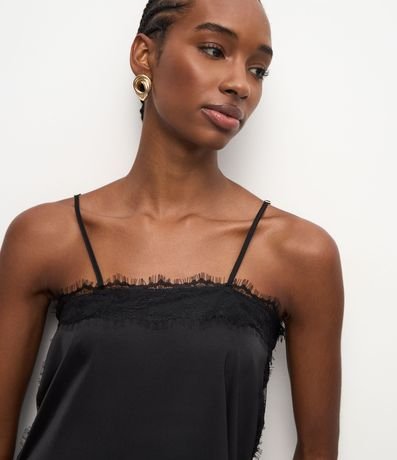 Ref: Blusa feminina acetinada sem mangas, com alças finas ajustáveis, decote quadrado, renda delicada aplicada no busto, laterais e barra.