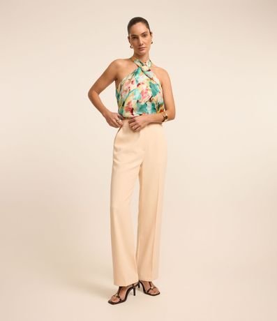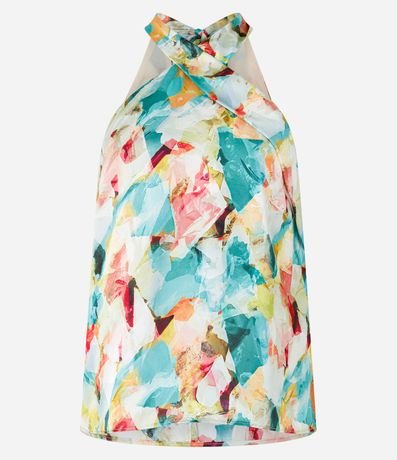 Ref: Blusa sem mangas com com gola halter com amarração laço no pescoço, cavas americanas e estampa abstrata. Possui efeito acetinado.