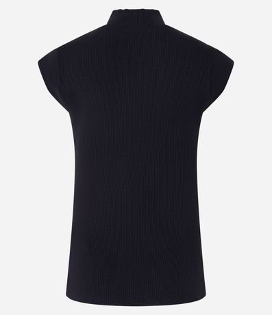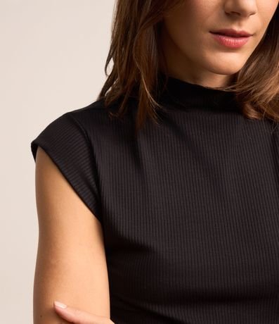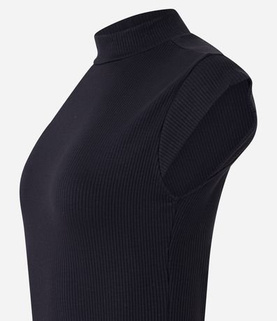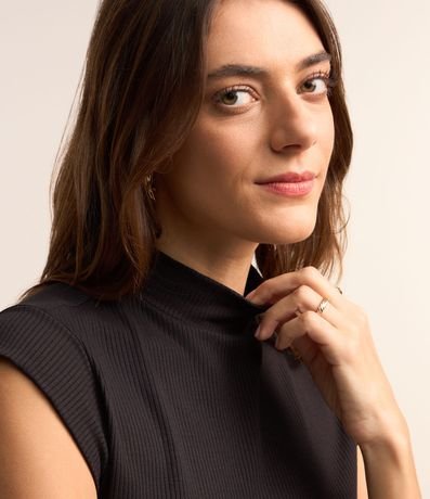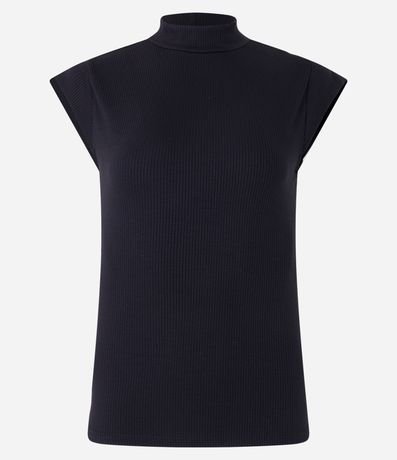 Blusa feminina ajustadinha, sem manga, confeccionada em ribana, com golinha alta, ombros largos e textura canelada.