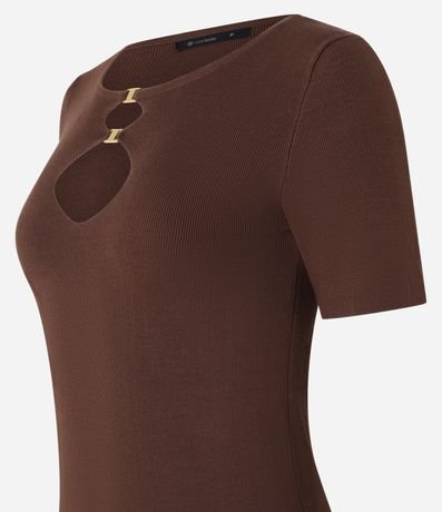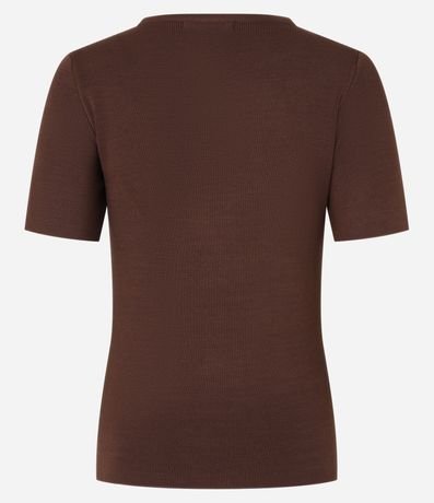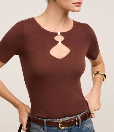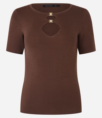Ref: Blusa de modelagem justa e mangas curtas, confeccionada em tricô leve, com gola redonda e aberturas vazadas com fivelas. Este produto possui viscose certificada em sua composição, sendo ambientalmente mais responsável.