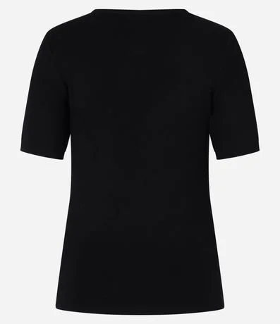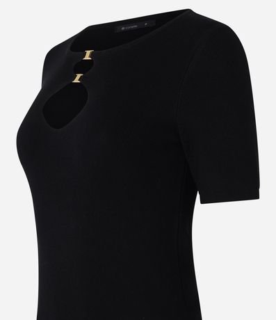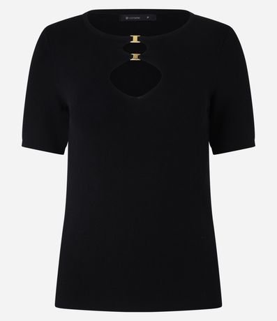 Blusa de modelagem justa e mangas curtas, confeccionada em tricô leve, com gola redonda e aberturas vazadas com fivelas. Este produto possui viscose certificada em sua composição, sendo ambientalmente mais responsável.
