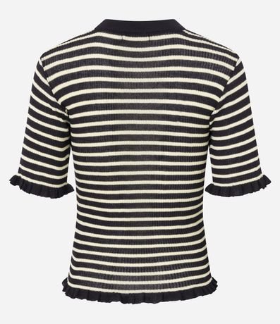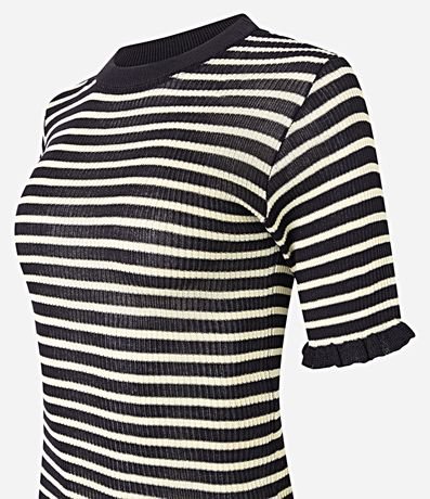 Ref: Blusa feminina confeccionada em tricô mais sustentável, no modelo ajustada. Possui gola redonda, manga curta, viés contrastante, com frufrus e estampa de listras.