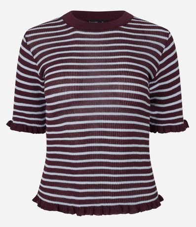 Blusa feminina confeccionada em tricô mais sustentável, no modelo ajustada. Possui gola redonda, manga curta, viés contrastante, com frufrus e estampa de listras.