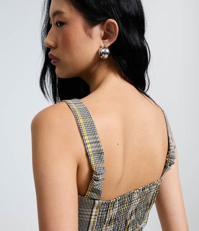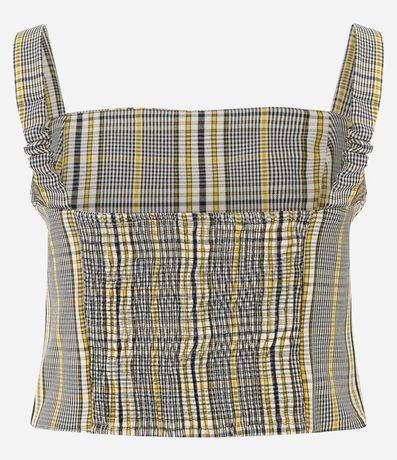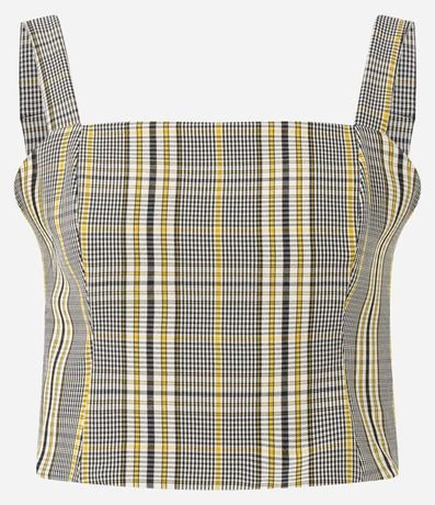 Blusa feminina confeccionada em poliéster com elastano, possui decote quadrado, alças largas, estampa xadrez e fechamento por zíper nas costas.