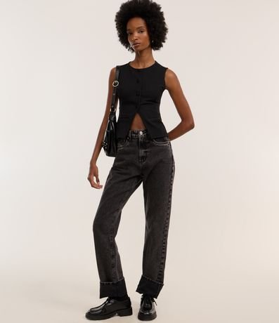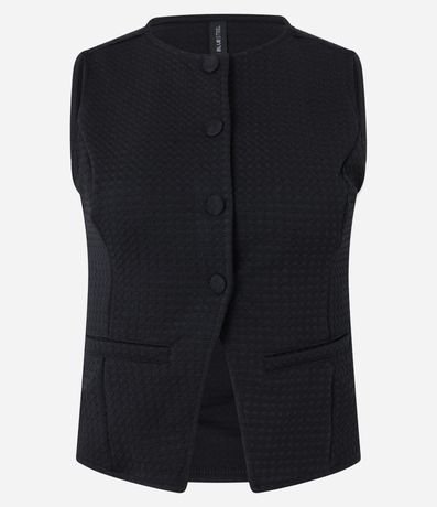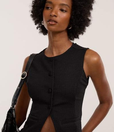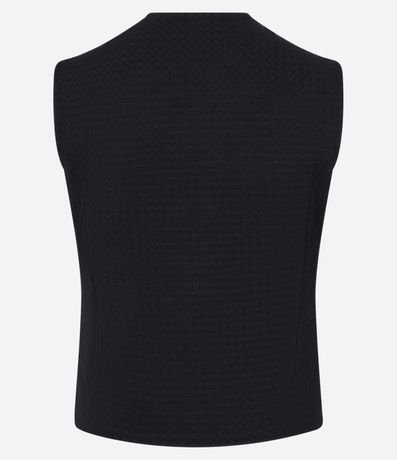 Blusa sem manga, em alfaiataria, texturizada com friso frontal e recorte em v na barra.