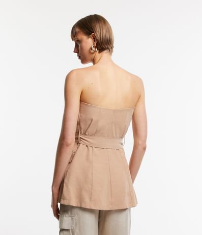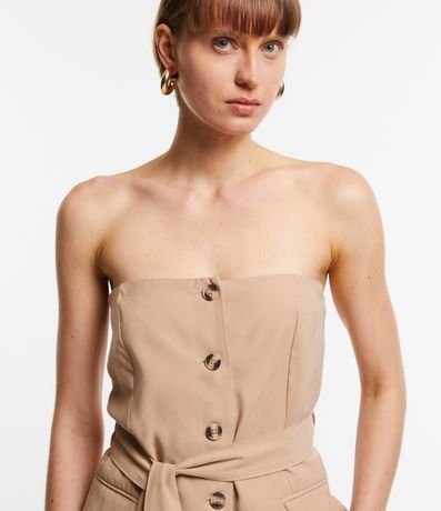 Ref: Blusa alongada, alfaiatada, de modelo tomara que caia, com botões frontais e amarração na cintura.