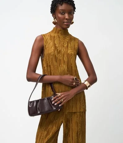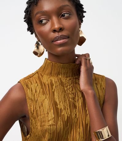 Ref: Blusa feminina sem mangas em malha texturizada com efeito amassado. A modelagem é alongada, golinha alta, caimento reto e tecido com relevo.