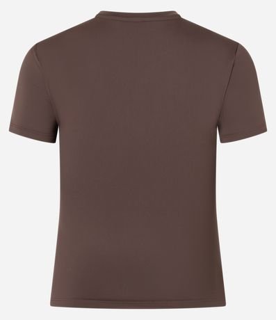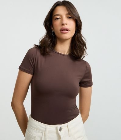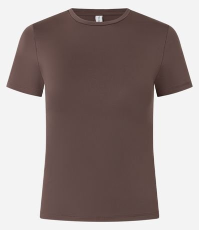Blusa feminina de modelo alongada, confeccionada em poliamida com gola redondinha, manga curta, básica e sem estampas.