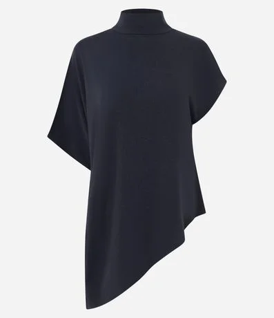 Blusa feminina em tricô confeccionado com viscose mais sustentável. Possui gola alta ajustada, mangas curtas estilo capa, modelagem assimétrica com barra diagonal e costura central nas costas.