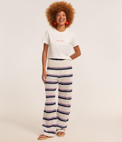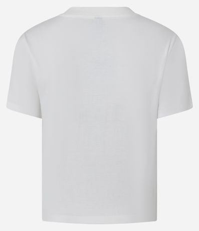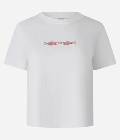 Ref: Blusa feminina confeccionada em algodão mais sustentável através de boas práticas ambientais, no modelo baby look. Possui gola redonda, manga curta e estampa bordada de peixes.