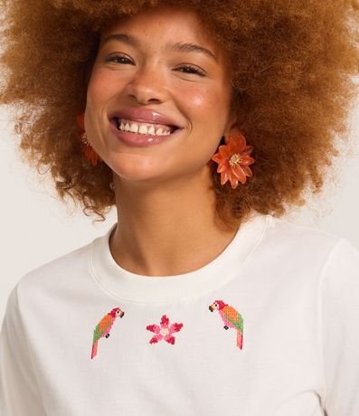 Ref: Blusa feminina confeccionada em algodão certificado bci com boas práticas ambientais, peça com gola redonda, manga curta e estampa tropical e araras e flor bordada próxima a gola.