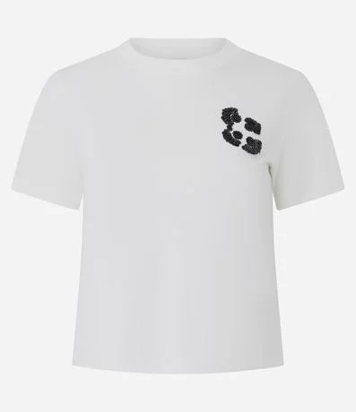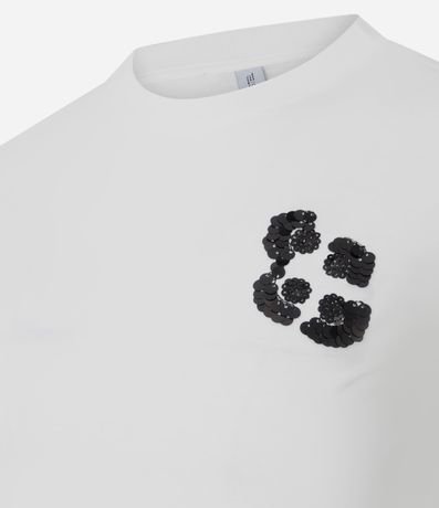 Blusa em algodão com bordado floral em paetê, trazendo brilho sutil e toque elegante ao visual. Possui modelagem baby look, gola redonda e caimento confortável para o dia a dia. Peça versátil, confeccionado em algodão de certificado BCI.