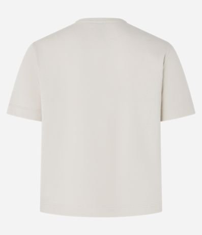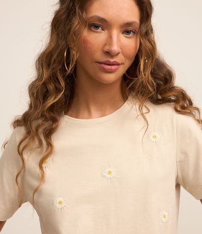 Ref: Blusa feminina confeccionada em algodão, no modelo baby look, gola redonda, manga curta e estampa bordada de margaridas.