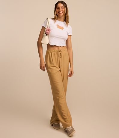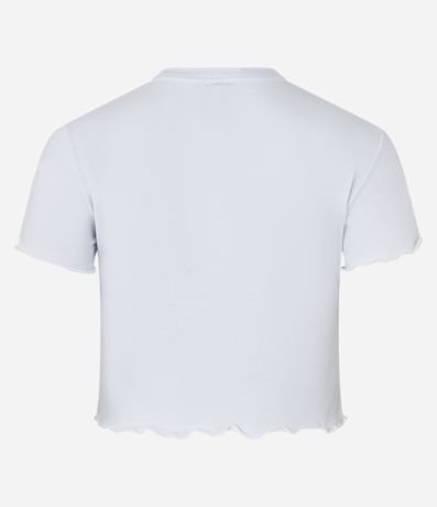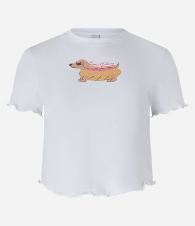 Ref: Baby look manga curta com frufru nas mangas e barra, confeccionada em algodão mais sustentável e com estampa frontal doguinho, cachorro quente.