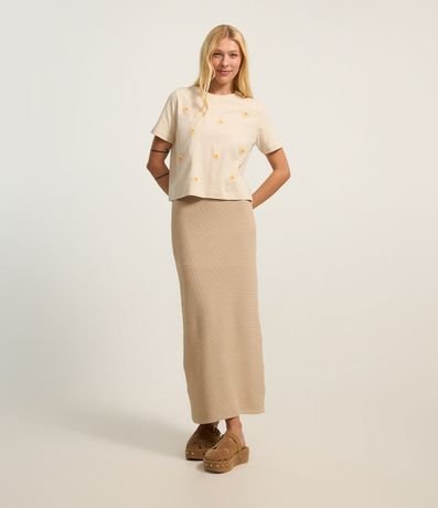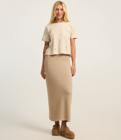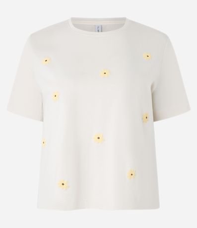 Ref: Blusa baby look com manga curta, confeccionada em algodão bci mais sustentável, produzida em boas práticas ambientais e estampa em repetição de florzinhas.