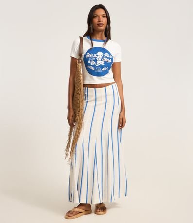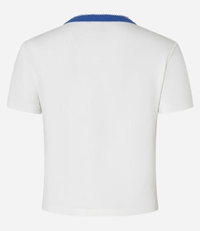 Ref: Blusa baby look com manga curta, gola redonda contrastante e estampa frontal tropical, fundo do mar com. Peça confeccionada em algodão bci produzida através de boas práticas ambientais.