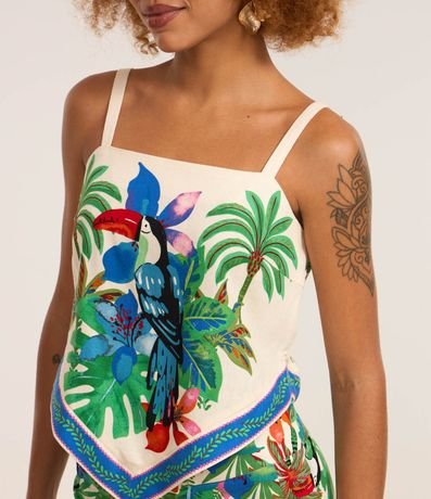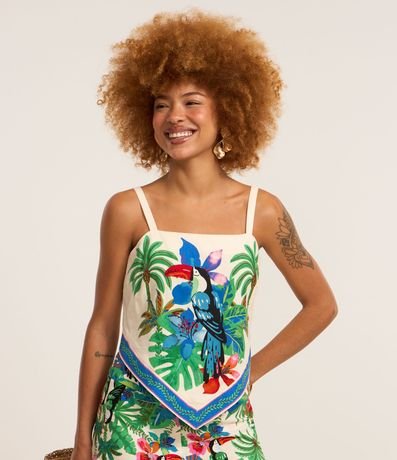 Blusa  feminina confeccionada em viscose mais sustentável, no modelo baby look. Possui decote reto, alças finas reguláveis, aspecto de lenço, estampa tropical de tucano e diferencial de barra em V.
