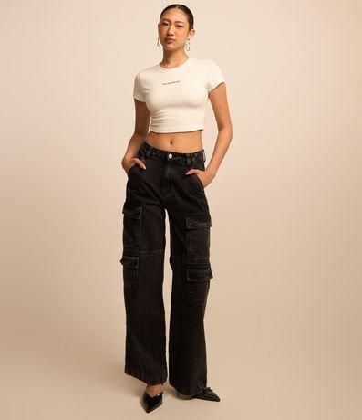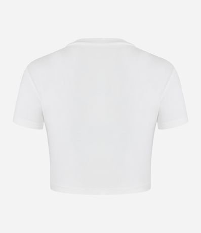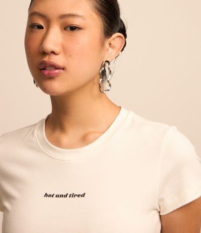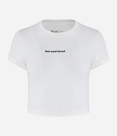 Blusa baby tee com manga curta, confeccionada em algodão e com estampa em lettering no peito, Hot and Tired.