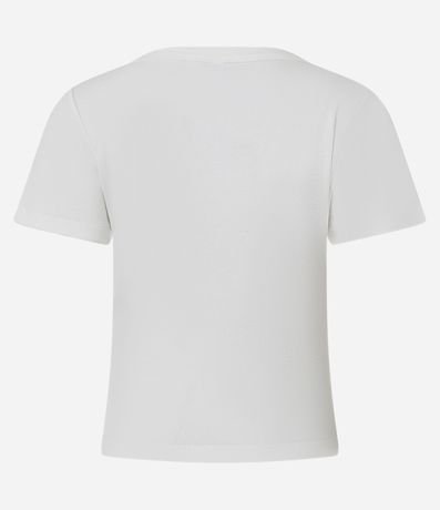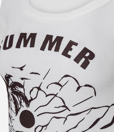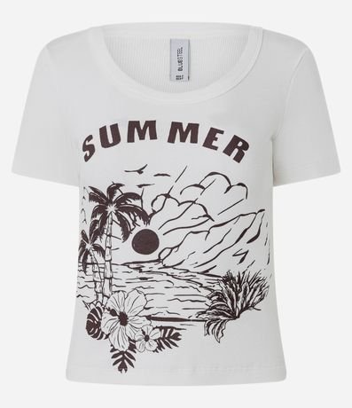 Ref: Blusa feminina de modelo baby tee confeccioanda em malha ribana de algodão, com gola redonda e mangas curtas. Possui textura caneladinha e estampa frontal de paisagem, com flores e lettering "Summer".