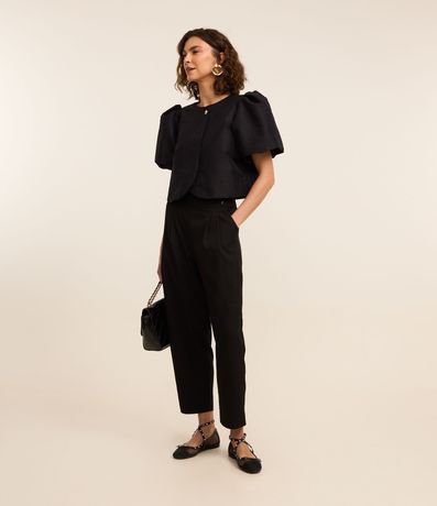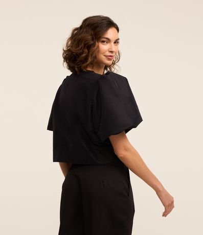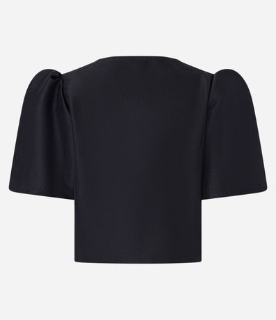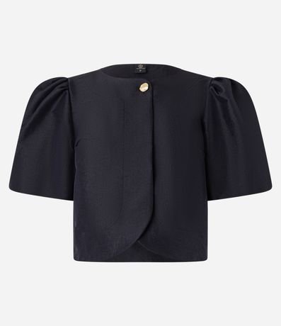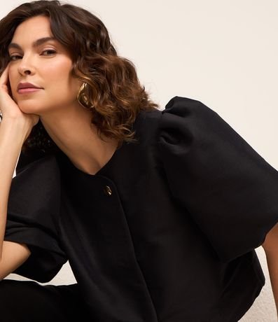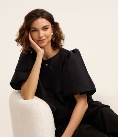 Ref: Blusa balonê com manga curta bufante, botão na gola e barra arredondada.