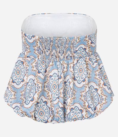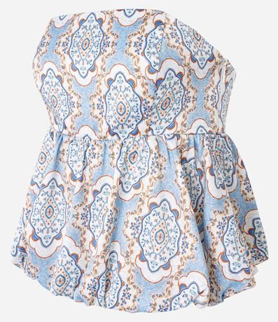 Blusa feminina de modelo balonê, com toque acetinado e sem alças. Possui estampa abstrata e elástico nas costas.