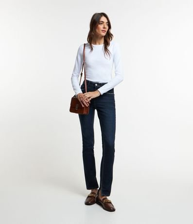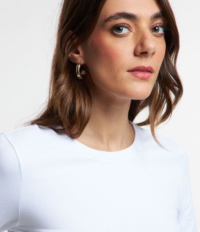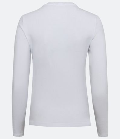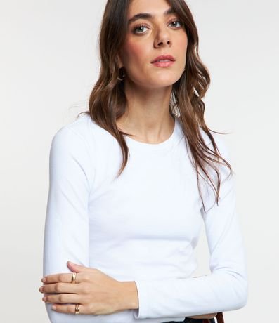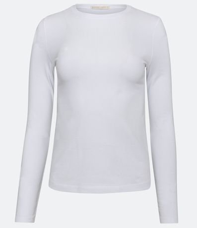 Blusa básica em algodão com gola redonda, manga longa e sem estampa.