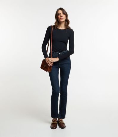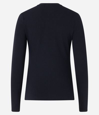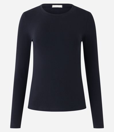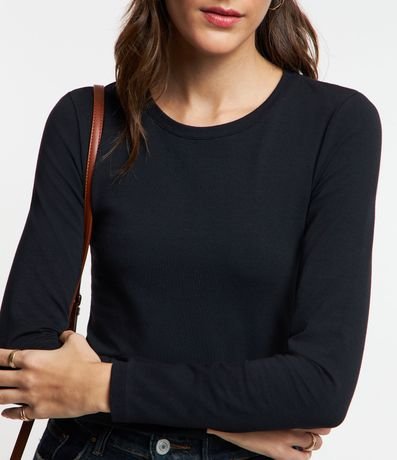 Blusa básica em algodão com gola redonda, manga longa e sem estampa.